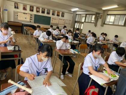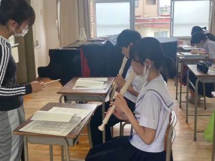 2年生の音楽の授業では、アルトリコーダーのテストを行っています。「オーラリー」の曲を運指やリズム、音階などを正確にできるように学習しています。
