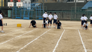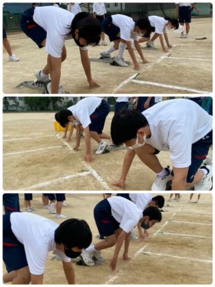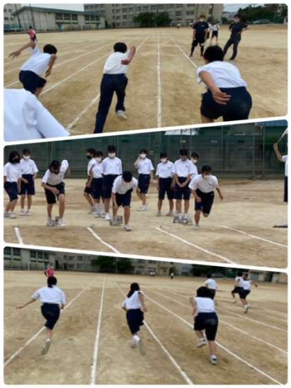 2年生の保健体育の授業です。新体力テストの50m走に取り組んでいます。感染症対策のため、走る時以外はマスクを着用するように指導しています。一生懸命走る姿はかっこいいです。