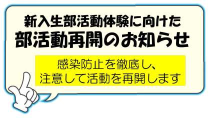 本校においても、新入生部活動体験や一斉入部に向けて、部活動を再開してまいります。ご理解いただきますよう、お願いいたします。詳細については、配付プリントをご覧ください。