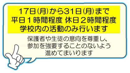 「緊急事態宣言」期間中の部活動は、原則休止しております。ただし、公式戦を控えている場合など、学校が必要であると判断した場合は感染症対策を徹底したうえで、注意して活動を行うことができるとされています。