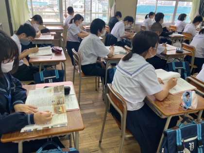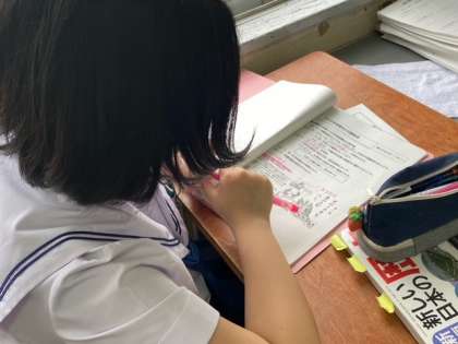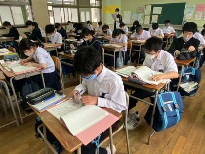 3年生の社会の授業では、日本国憲法の学習を行っています。歴史的分野と公民分野が重なるような内容です。時事ニュースをよく見ておくことも大切ですね。