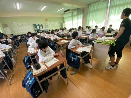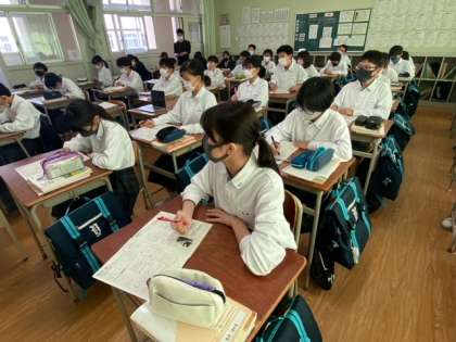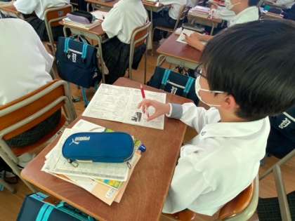 1年生の国語の授業です。詩「朝のリレー」の内容把握のプリントに取り組んでいます。文字数の指定にあわせて書く力を育むように指導しています。