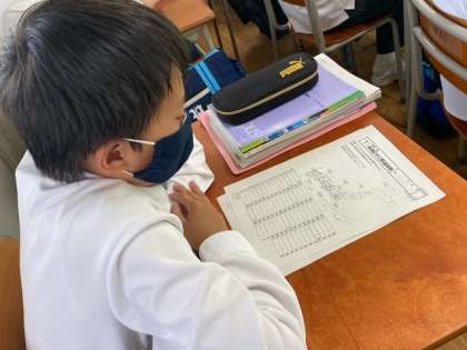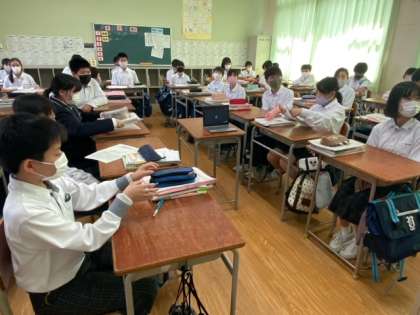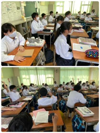 1年生の社会の授業では、世界地図について学習しています。先生からの問いに積極的に手を挙げる生徒たちがたくさんいます。