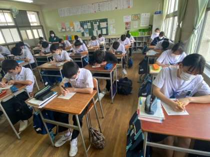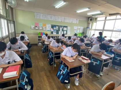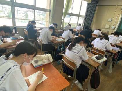 3年生の国語の授業です。3年国語の授業時数が週3時間になったため、学習内容の進み方に工夫が必要です。小テストも定期的に実施して、基礎基本の定着を図っています。
