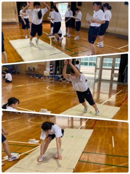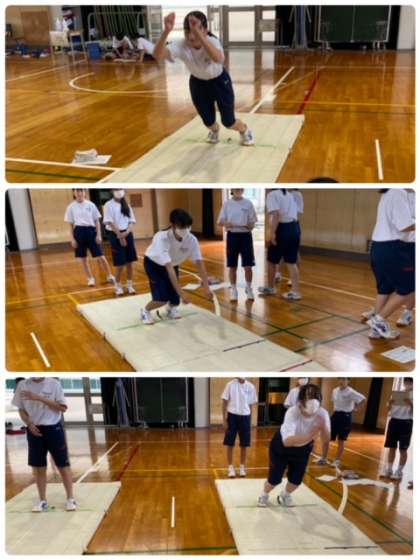 2年生の女子体育の授業では、立ち幅跳びを行っています。新体力テストの種目をどんどん行って、昨年よりいい記録を伸ばすように頑張っています。