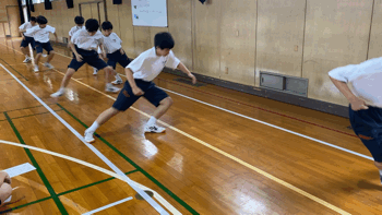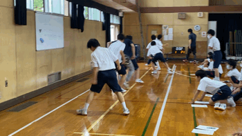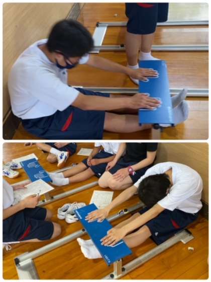 2年生の男子体育の授業では、反復横跳びと長座体前屈を行っています。1回でも多く、1センチでも長くできるように、競い合いながら一生懸命に頑張っています。