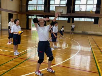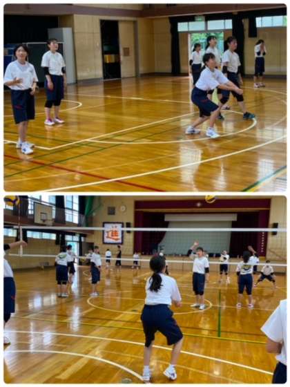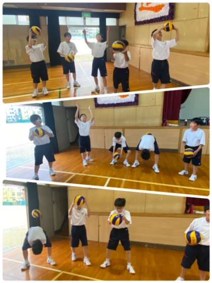 体育館では、バレーボール部が活動を再開しています。1年生男子もたくさん練習に参加しています。先輩たちに交じって、元気に活動しています。