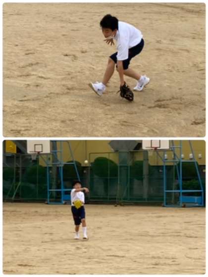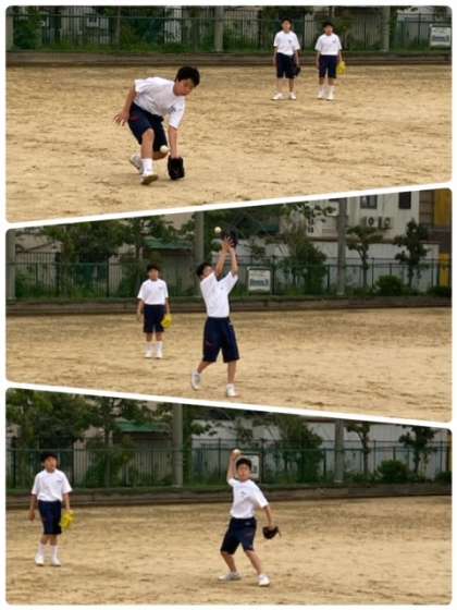 小雨の中、グラウンドで野球部が部活動体験を行っています。2年生がノックを打ってくれて守備練習です。元気に活動しています。