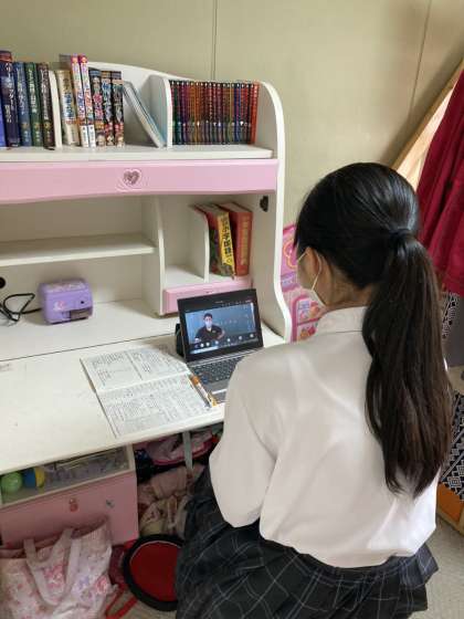 午前中のオンライン授業配信を家庭で受けている様子です。制服で姿勢正しく、課題プリントをきちっと用意して取り組んでいます。今週いっぱいは、オンライン授業配信を行う予定です。