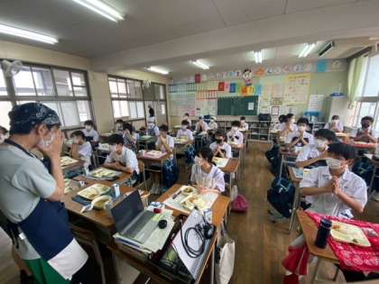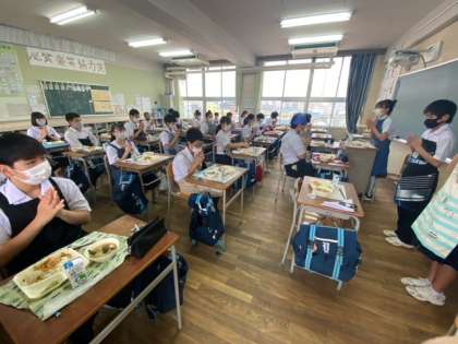 2年生の給食の様子です。「いただきます」は、食事を始める際の日本語のあいさつです。「いただく」は「食べる」の謙譲語から派生したものです。国語の授業で学習している内容が含まれています。