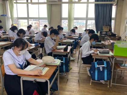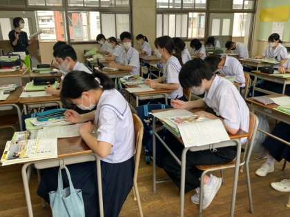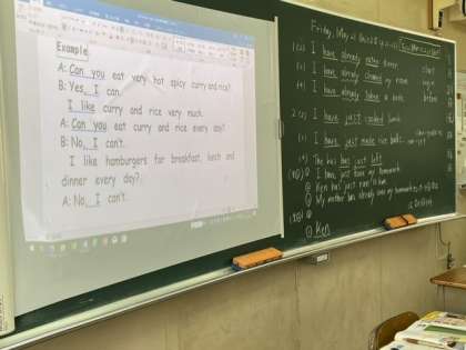 3年生の英語の授業です。黒板には英文を投影して解説をしています。定型文のポイントを色付けしてわかりやすいように工夫しています。