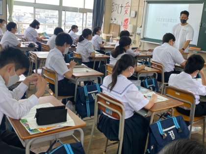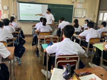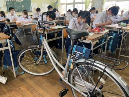 2年生の技術の授業では、エネルギーの単元を学習しています。身近なものとして、自転車のライトを説明するために、教室で実践して見せています。