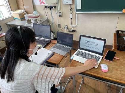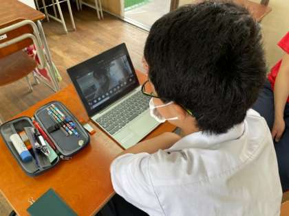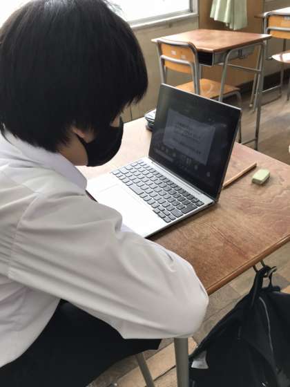 2年生のオンライン授業配信の様子です。導入にクイズを出して興味関心を高めています。