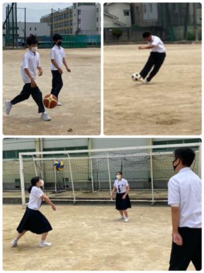 バレーボール、バスケットボール、サッカー等、男女、先生も交じってみんなで活動しています。思いっきり体を動かす機会が少ないので、とても楽しそうです。