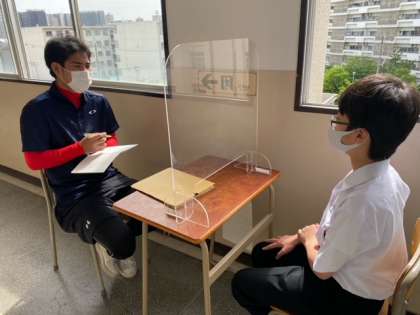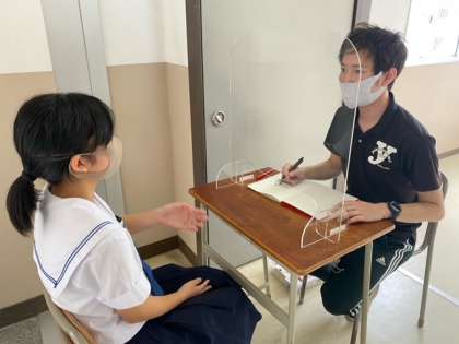 2年生の特別活動の時間は、教育相談を行っています。通常授業が再開して、ようやくさまざまな活動ができるようになりました。担任の先生と向き合って、じっくり話をしています。
