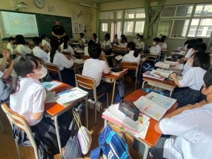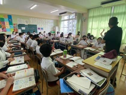 1年生の社会の授業では、コの字型で学習を行っています。緯度と経度、大陸と海洋の分布、主な国々の名称と位置などを基に、世界の地域構成を大観し理解することをねらいとしています。