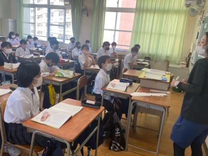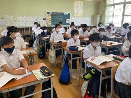 1年生の道徳の授業です。道徳では、自分自身に関すること、集団や社会との関わりに関すること、人との関わりに関すること、生命や自然・崇高なものとの関わりに関することを学びます。