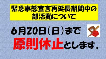 「緊急事態宣言」の実施期間が6月20日まで再延長されることが決定され、部活動について次のとおり進めることとなりました。本日、お知らせプリントを配付しましたので、詳細についてはご覧ください。