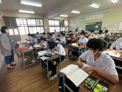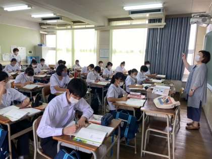 2年生の国語の授業では、短歌の学習を行っています。区切れや語句の意味などを確認し、浮かぶ情景を描いていきます。31音で表す表現を学んでいます。