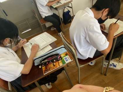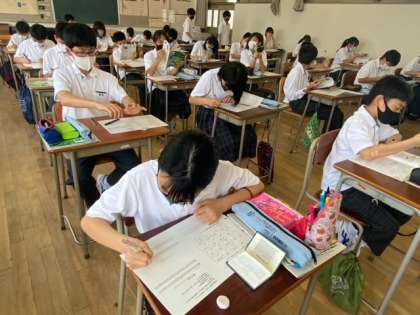 1年生の音楽の授業です。校歌の歌唱テストを行っています。本校の校歌を全員で歌唱する日がいつかくることを願っています。新型コロナウイルス感染症の終息を心待ちにしています。