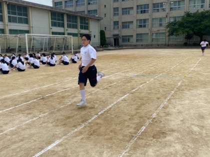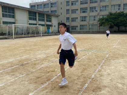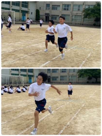1年生の男子保健体育では、100m走のタイムを計測しています。ニュースでは、山縣選手が日本新記録を樹立したと聞いて、生徒たちも意気込んで走っています。