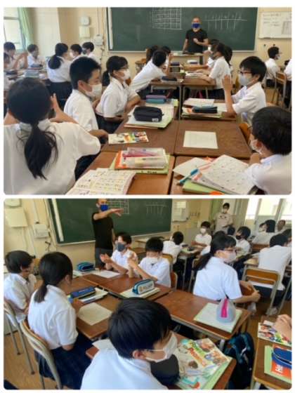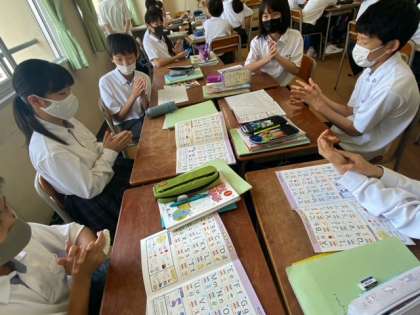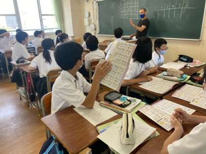 1年生の英語の授業です。John先生とグループ学習で学んでいます。英単語ゲームで、生徒たちが自ら活発に参加している様子がみられます。楽しく学ぶことで、学習内容が定着していきます。