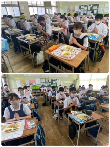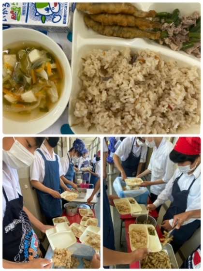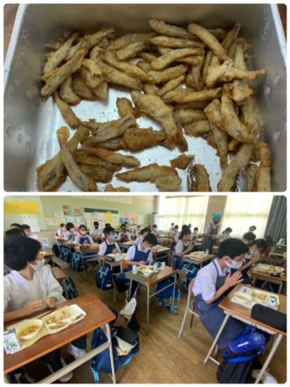 今日の給食メニューは、かやくご飯、いわしのてんぷら、五目汁、豚肉と三度豆のいためもの、牛乳です。今年度から「かやくご飯」が導入され、初めての実食です。いわしのてんぷらとともに、たくさん食べます。今日も美味しくいただきました!