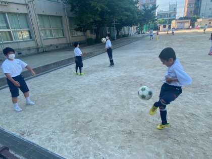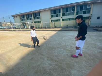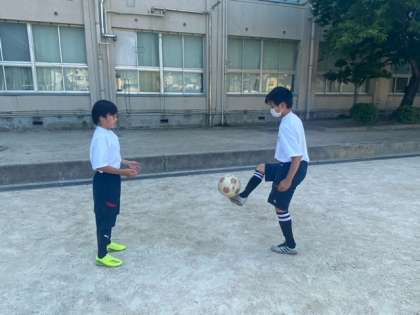 サッカー部の練習の様子です。ウォーミングアップとして、1年生がペアリフティングを行っています。リフティングする方も投げる方も重要なようです。繰り返し練習しています。