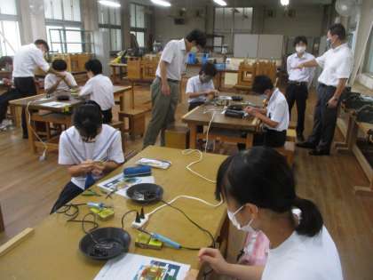 生徒たちは、二つの授業を選択します。講座名としては、例えば「チーム医療などについて、いのちの輝きを支える方法を体験する(福祉科)」「メロディアラームの作成(工業科)」「実験結果から原因について議論する(文理学科)」「モダンテクニックー絵具を利用して色彩鑑賞を行うー(総合学科)」等、様々です。二つの授業(学科)を選択することで、それぞれの学科の特色もよく理解できたことと思います。