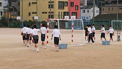 男子の体育はハンドボールをしています。