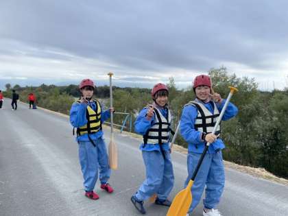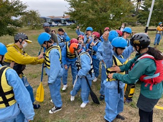 ライフジャケットの点検をし、階段を降って川に降りていきます。