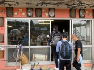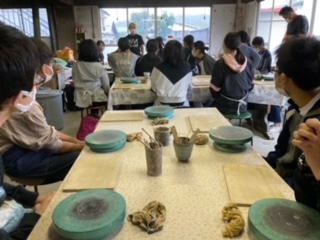 陶芸体験のグループが会場につき説明を受けています。1人につき2つ作品を作ることが目標です。
