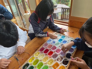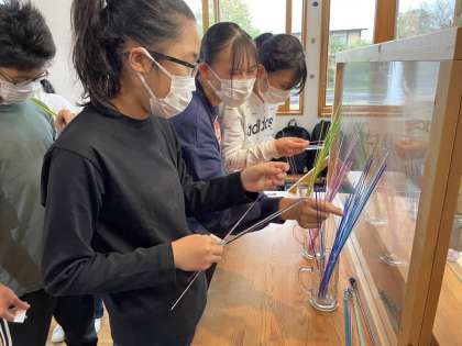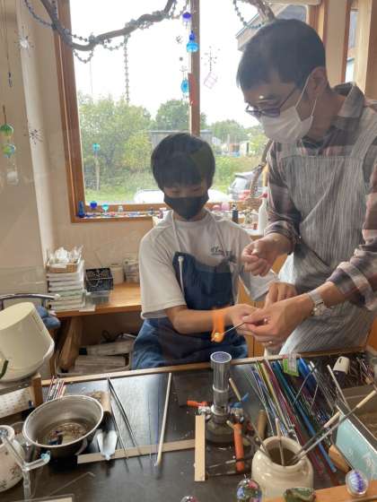 説明をうけてトンボ玉の制作をしています。みんな真剣に取り組んでいます。