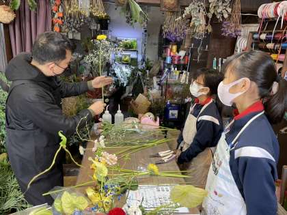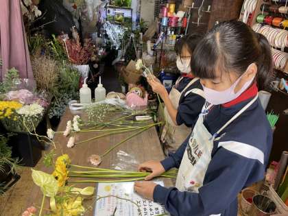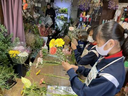 フラワーショップ沙樹では、花束の作り方を教わり、世界に一つだけの花束を作っています。