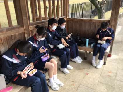 班ごとに場所を決め、持参したお弁当を食べます。若草山周辺の班です。