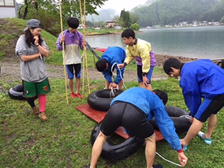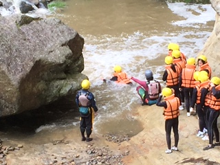 選択体験 (キャニオニング・マウンテンバイク・いかだ作り)を行いました。始まる時には雨も上がり薄日も射すコンディションでした。パラグライダーは天候の関係で中止となりました。開始10:00〜