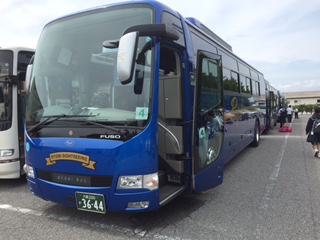 これがスイス村での昼食です。いつもは楽しみな食事もこれで終わりかも思うと複雑です。今安曇野出発です。バスで約6時間かかるようです。(到着予定19:25)私たちの町、横堤に帰ります。