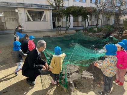学校近くのソフィア保育園から園児が中学校の鯉を見学に来てくれました。