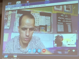 今日は、モロッコとのスカイプを使った国際交流を校内の多目的室で行います。今、モロッコとSkypeで繋がりました。これから交流を深めていきます。