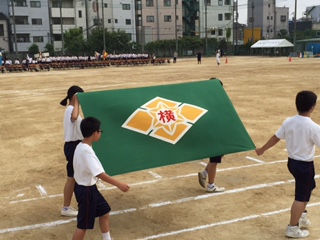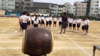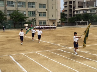 体育委員の打ち合わせをして予行開始です。入場行進。
