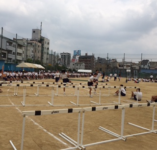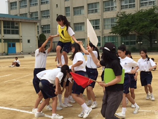 プログラム7 1年学年種目 船頭さん競争(写真左) 8 バラエティー競争(写真右)