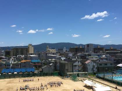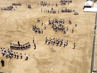 屋上から生駒山系を望んだ青空です。(写真左)晴れ渡る青空のもと、明日、運動会に向けての練習が、続いています。(写真右)クラスが心を一つにして、まとまることのできる、素晴らしい瞬間です。天気予報では心配もありますが、生徒のはつらつとしたパワーに、きっと雨雲も意気消沈することでしょう。