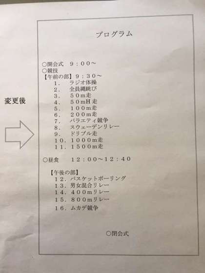 1部プログラム変更いたしました。午前中のプログラムで、1年生の学年種目を午後に回しています。午前の部、最後に3年生学年種目を入れています。午後の部については大幅に変更していますのでよろしくお願いします。なお、天候が持つようならカットした競技は全て行います。急な変更ご理解ください。