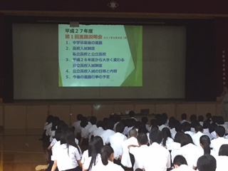 第1回進路説明会が行わなれました。1.中学校卒業後の進路 2.高校入試制度・私立高と公立高 3.来年度から大きく変わる公立高入試制度 4.公立高入試の日程と内容等についての話がありました。今週末土曜授業のあとで、「保護者向け進路説明会」を予定しています。ご参加ください。
