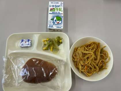 今日のメニューは、黒糖パン、カレースパゲッティ、レタスとコーンのサラダ、固形チーズ、牛乳です。