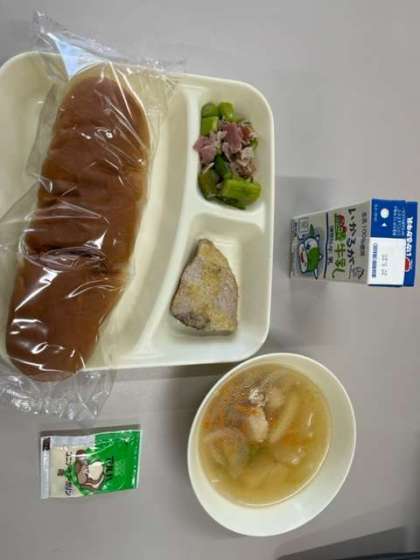 今日の献立は、コッペパン、マーガリン、かつおのガーリックマヨネーズ焼き、スープ、グリーンアスパラガスとベーコンのソテー、牛乳です。
