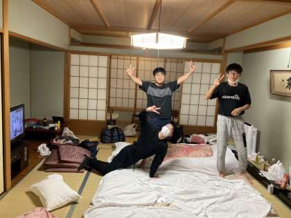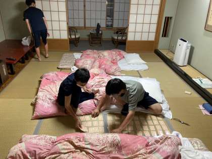旅の疲れを癒すため、ふかふかの布団で寝る準備を行っております。