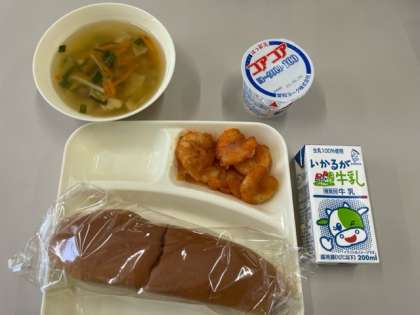 今日の献立は、黒糖パン、えびのチリソース、中華スープ、ヨーグルト、牛乳