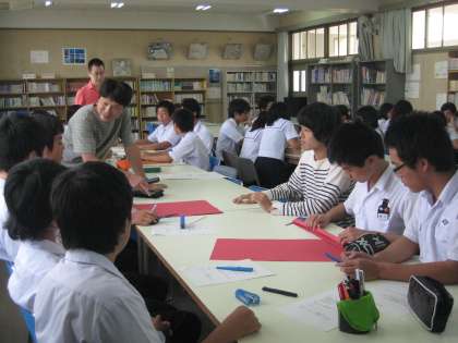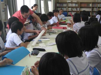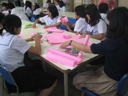 生徒たちは、グループ内で、いろいろな発想を提案をしあいながら、また、大学の先生や大学生からのアドバイスを参考にしながら、色画用紙を切ったり、折ったり、丸めたりして紙の強度を高め、個性的な橋作りに取り組んでいました。普段の教室の授業とは違った生徒の姿が見られ、グループごとに楽しそうに、活き活きと学習している姿が印象的でした。