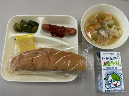 今日の献立は、コッペパン、アプリコットジャム、ウインナーのケチャップソース、スープ、きゅうりのサラダ、牛乳です。